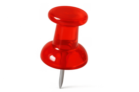 Red clear pushpin standing upright, marking a spot or location, office supply and stationery tool