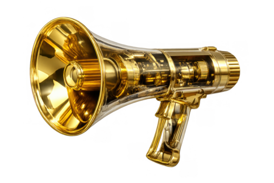 Golden megaphone with transparent body showing internal mechanism, symbolizing power, influence, and loud communication