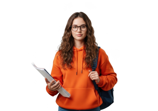 Young woman student with glasses and orange hoodie holding books ready for education transparent background