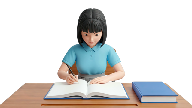 Concentration and Study: A young person intently studying a book at a desk, with a focused expression, and a plant and clock in the background.