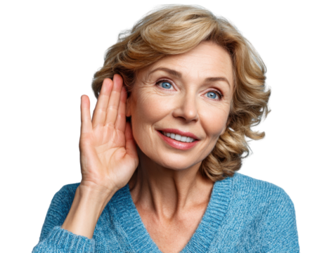 Listening intently: A middle-aged woman, her hand cupped near her ear, portrays attentive listening, embodying a gesture of active engagement and communication.