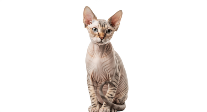 Unique hairless Sphynx cat sitting upright isolated on transparent PNG background