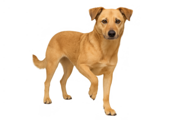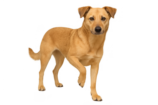 Brown mongrel dog standing with one paw raised, looking directly at the camera, showing friendliness and attentiveness