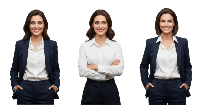 Woman in business attire posing in three different positions isolated on white transparent png background download