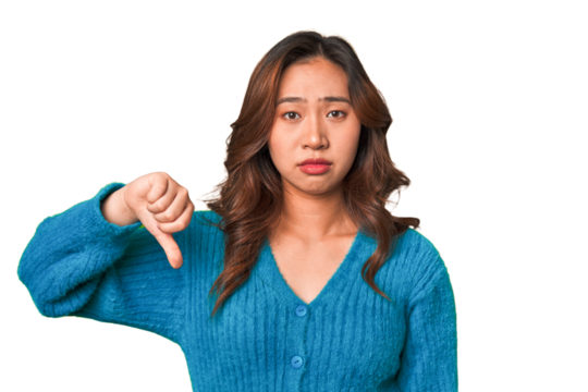 Happy brunette woman giving thumbs up isolated on transparent background