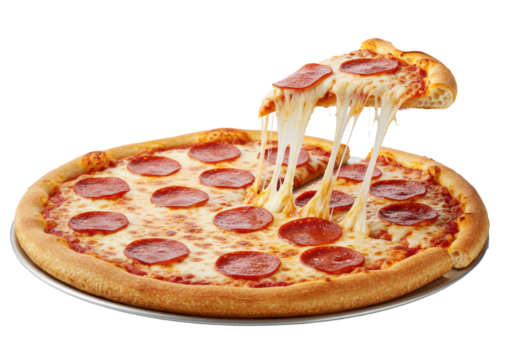 Pepperoni pizza slice with cheese pull on white background