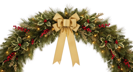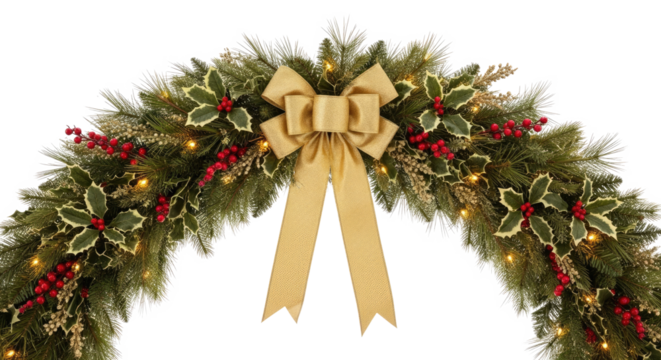 A beautifully decorated Christmas wreath with a gold bow and lights, adorned with holly and berries.