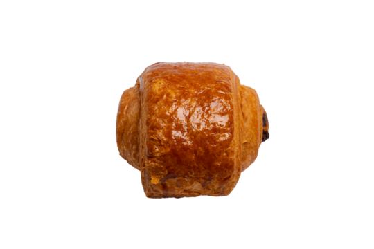 Golden-brown pain au chocolat with flaky layers and a glossy crust, chocolate filling barely visible at the edge isolated on transparent background.