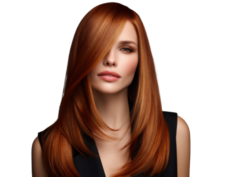 Radiant Locks: A woman with vibrant auburn hair, styled in flowing layers, embodies elegance and beauty, highlighting a captivating allure.