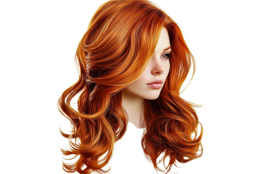 Luxurious auburn hair wig or hairpiece with voluminous waves isolated on isolated on white transparent background for beauty and fashion concepts