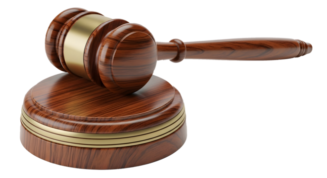 A gavel resting on its sound block with a transparent background in a studio setting close up view