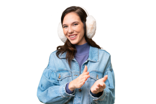 Young caucasian woman wearing winter muffs over isolated background applauding after presentation in a conference