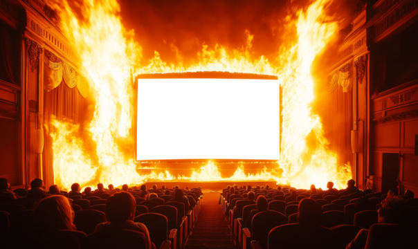Theater audience watching a blank screen engulfed in flames, symbolizing intense visual spectacle or metaphorical destruction of conventional storytelling