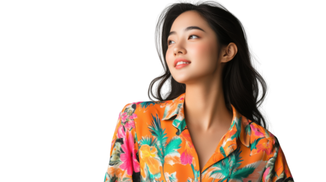 Smiling young asian woman wearing colorful shirt looking up on transparent background