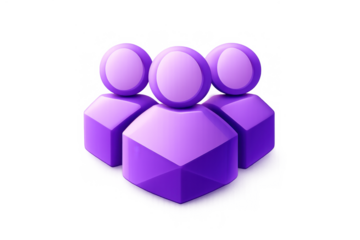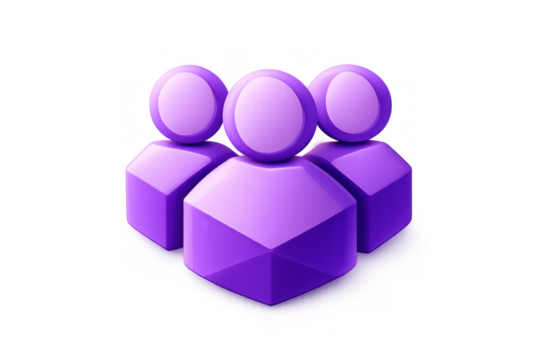 Three 3d purple user icons standing together, symbolizing team, community, network, teamwork, and partnership