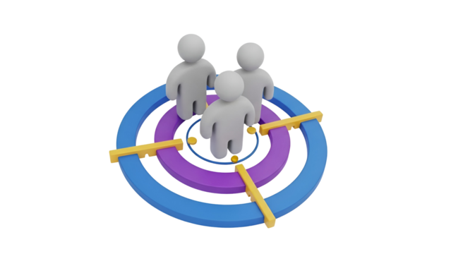 Target audience connection.  Circular arrangement of wooden discs, each with a person icon, surrounding a central target.  A red dart hits the bullseye