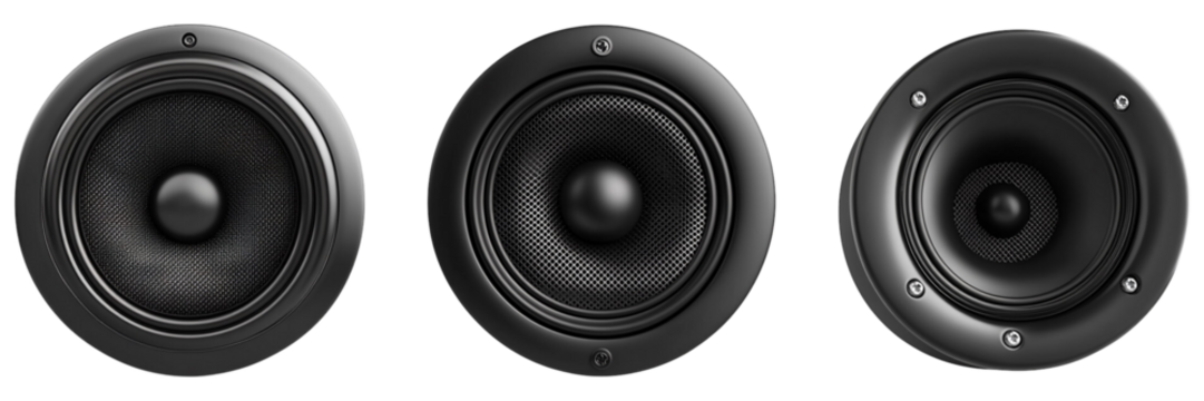 Three black speaker drivers on a white isolate background, showcasing a sleek design perfect for enhancing audio experiences and modern decor.