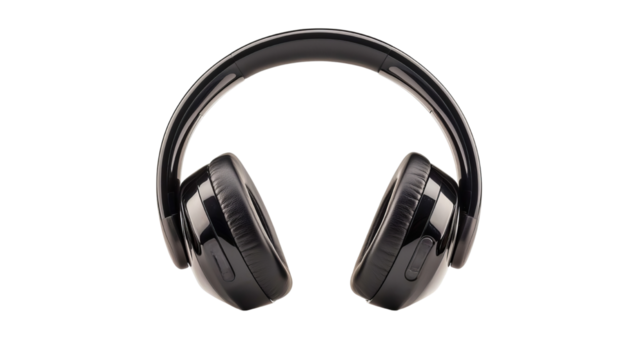 Black wireless over–ear headphones offering personal audio experience, listening to music or podcasts, with a transparent background