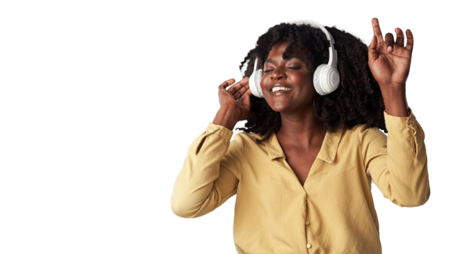 Phone, music headphones and child typing isolated on a transparent png background. Radio, smartphone and African girl listening to sound, audio or online podcast on social media, web app and internet