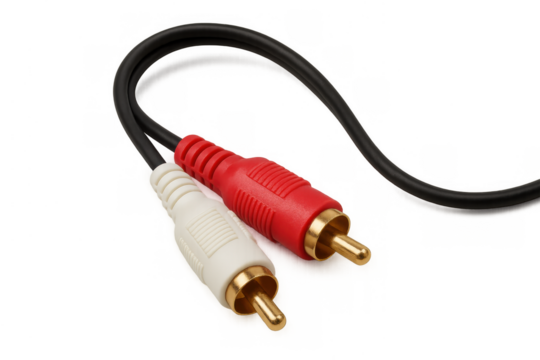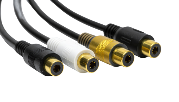 A close-up showing four colored (black, white, gold) and black electronic connection cables on a black backdrop