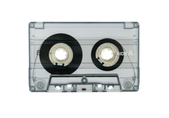 Vintage audio cassette tape showcasing transparent design, representing analog music era with retro sound recording technology