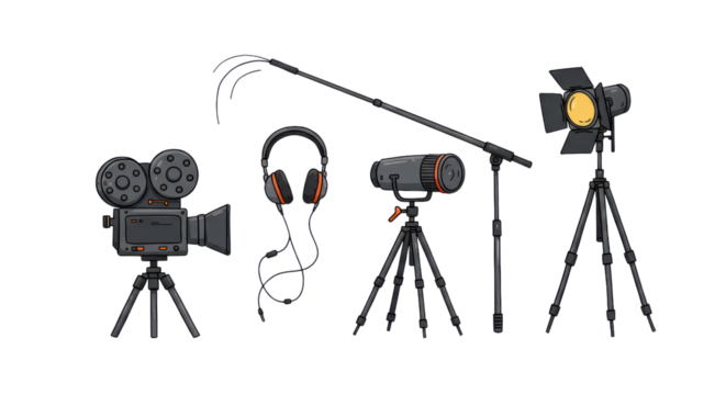 Vintage movie camera icon film production filmmaking cinema equipment video recording symbol graphic design on transparent background