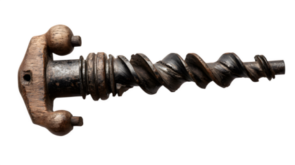 Hand Auger Tool: A detailed, photorealistic studio shot showcases a hand auger, a versatile tool for digging, featuring a wooden handle and a spiral-shaped metal drill bit.