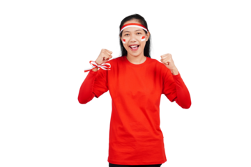 An excited Indonesian woman celebrating Indonesia's independence day standing while raising her fist isolated transparent