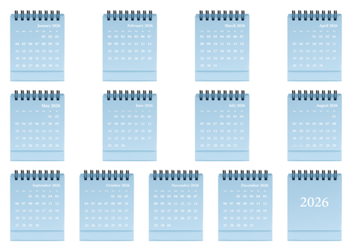 Blue desktop calendar template featuring clean grid layout, spiral-bound planner mockup with monthly pages for 2026 organization
