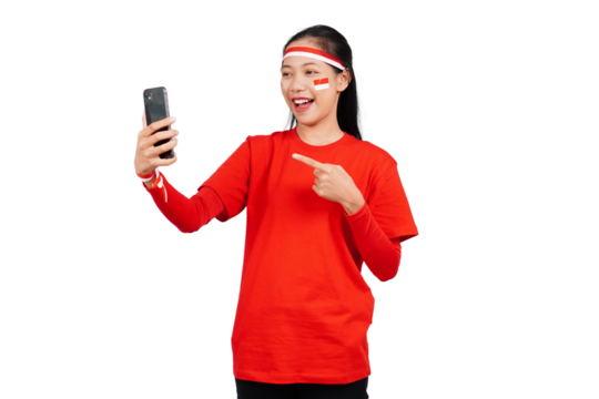 An Indonesian woman celebrating Indonesia's independence day on 17 August while holding smartphone with blank screen isolated transparent