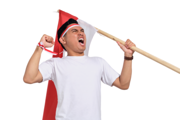 Indonesian man celebrating Indonesia's independence day on 17 August by holding the Indonesian flag isolated transparent
