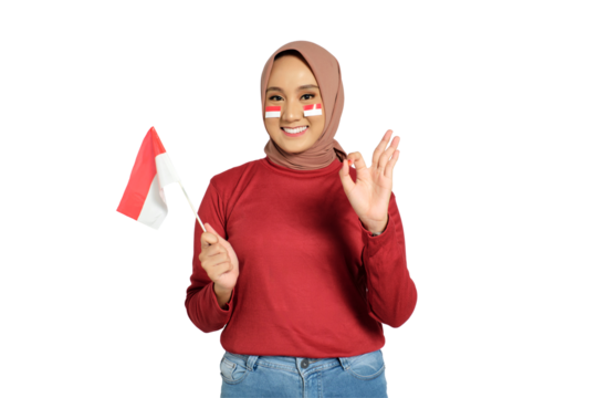 Happy young Asian women celebrate Indonesian independence day on 17 August by holding the Indonesian flag and doing ok sign isolated on transparent background