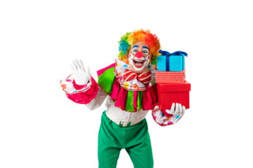 Funny female clown with gifts, woman entertainer dressed as a colorful Joker in a suit and wig, with clown whiteface makeup. She is a trickster, jester, pantomime, mime, professional actor at events