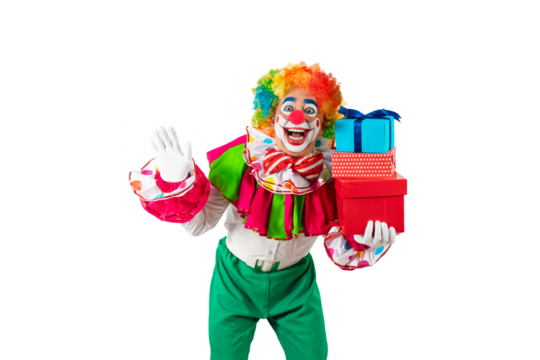 Funny clown with gifts. Entertainer Joker in colorful suit and wig. Buffoon pantomime, mime with clown whiteface makeup. Professional actor at event, kids party, circus