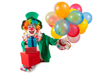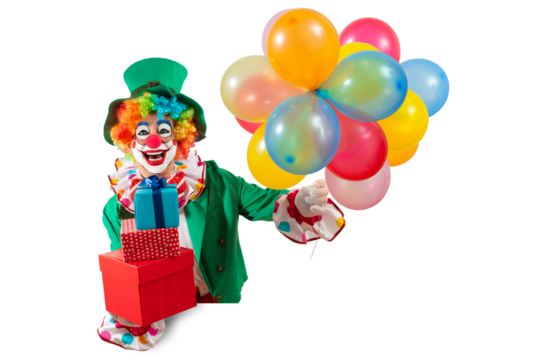 Funny clown with balloons and gifts. Entertainer Joker in a colorful suit and wig at the birthday party. Professional actor pantomime, mime with clown whiteface makeup.