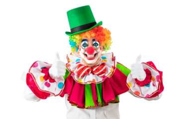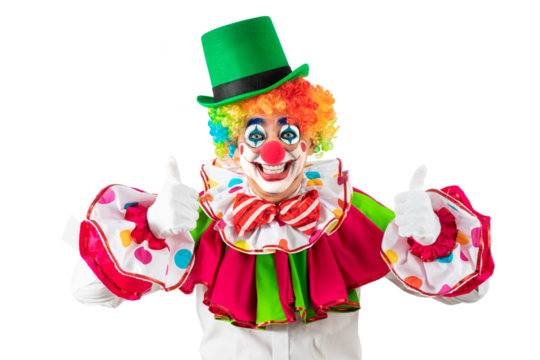 Funny clown with thumbs up. Entertainer Joker in colorful suit and wig. Buffoon with clown whiteface makeup. Trickster, jester, pantomime, mime. Professional actor at event, kids party, circus