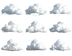 Nine fluffy white cloud formations set against a solid black background