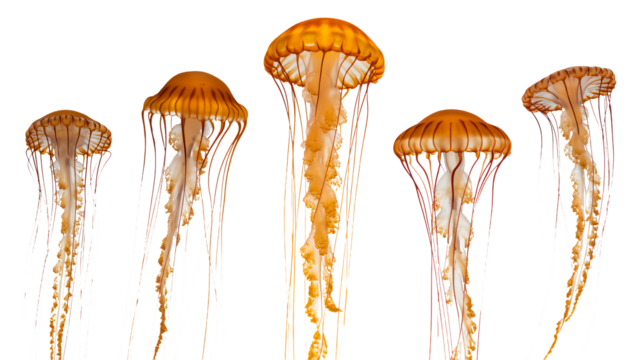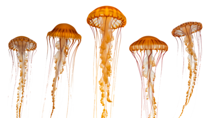 Golden translucent jellyfish swim, bioluminescent, elegant forms
