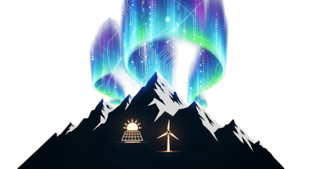 Scenic Mountains with Solar Panel and Wind Turbine beneath Aurora Borealis