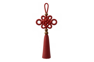 Chinese knot with red tassel and wooden beads, symbolizing luck, longevity, and good fortune. 3d render with transparent background