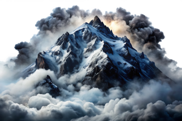 dark snow covered mountains landscape surrounded by smoke and clouds isolated on white background ,PNG.AI Generated.