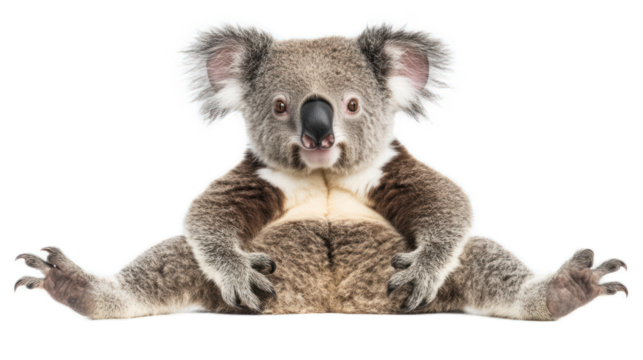 A playful koala sitting with its legs spread wide, surrounded by lush greenery in the background