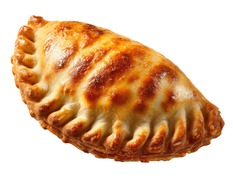A golden baked empanada pastry with crimped edge and neat seam, three-quarter view, isolated on transparent background.