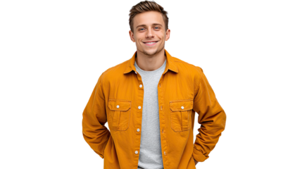 Smiling Young Man in Orange Shirt: Capturing a genuine moment, a young man radiates positivity, donning an orange shirt, his warm smile perfectly complementing his natural, confident pose.