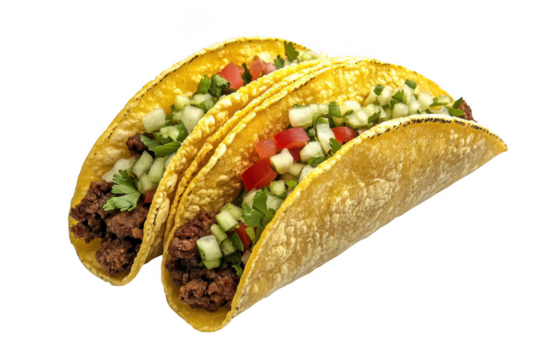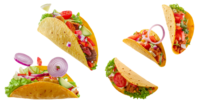 Delicious mexican tacos with meat and vegetables isolated on transparent background
