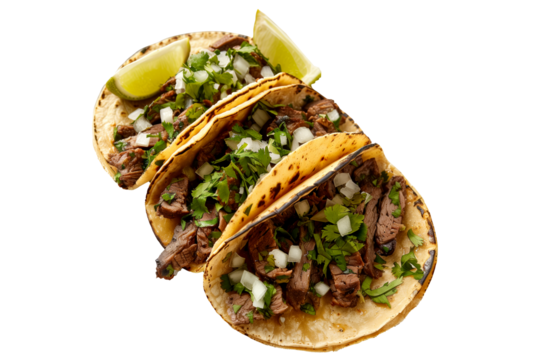 Delicious authentic mexican tacos with beef, tomato, cucumber, and cilantro filling, traditional cuisine, food photography, isolated on transparent background