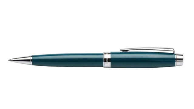 Isolated teal ballpoint pen office supply, metallic accents and clip, elegant writing tool