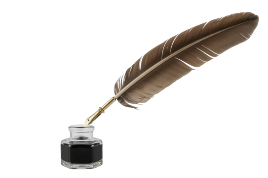 Isolated Feather quill and green inkwell, writing concept, antique tool, gold color, traditional