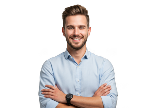 Smiling man in light blue shirt with crossed arms confident professional pose transparent background