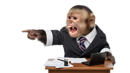 Angry Monkey Business Executive in Suit Pointing and Yelling at Desk isolated PNG with Transparent Background